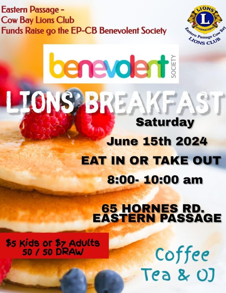 The Eastern Passage/Cow Bay Lions Club are hosting a Brekfast on Saturday, June 15th, with proceeds going towards the EP-CB Benevolent Society.